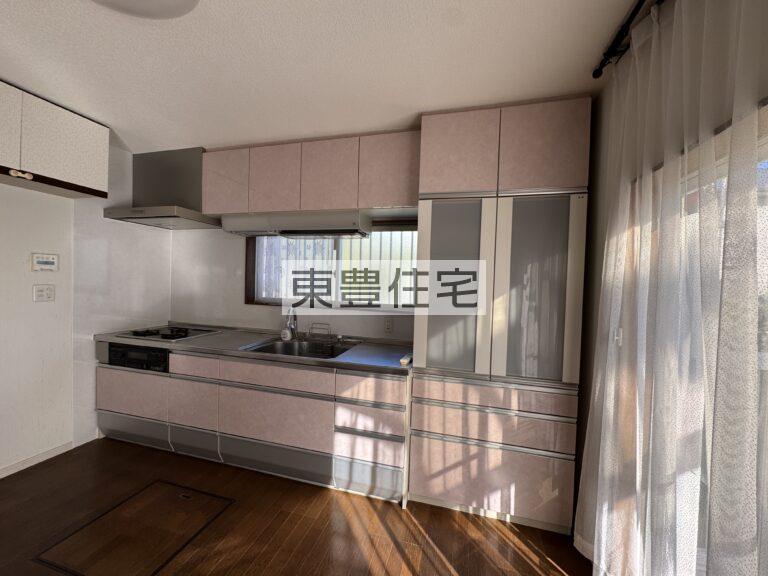 スライド収納とカップボードのついた収納たっぷりのシステムキッチン、バスルーム、1階トイレ、洗面化粧台は2013年4月に交換リフォーム済。