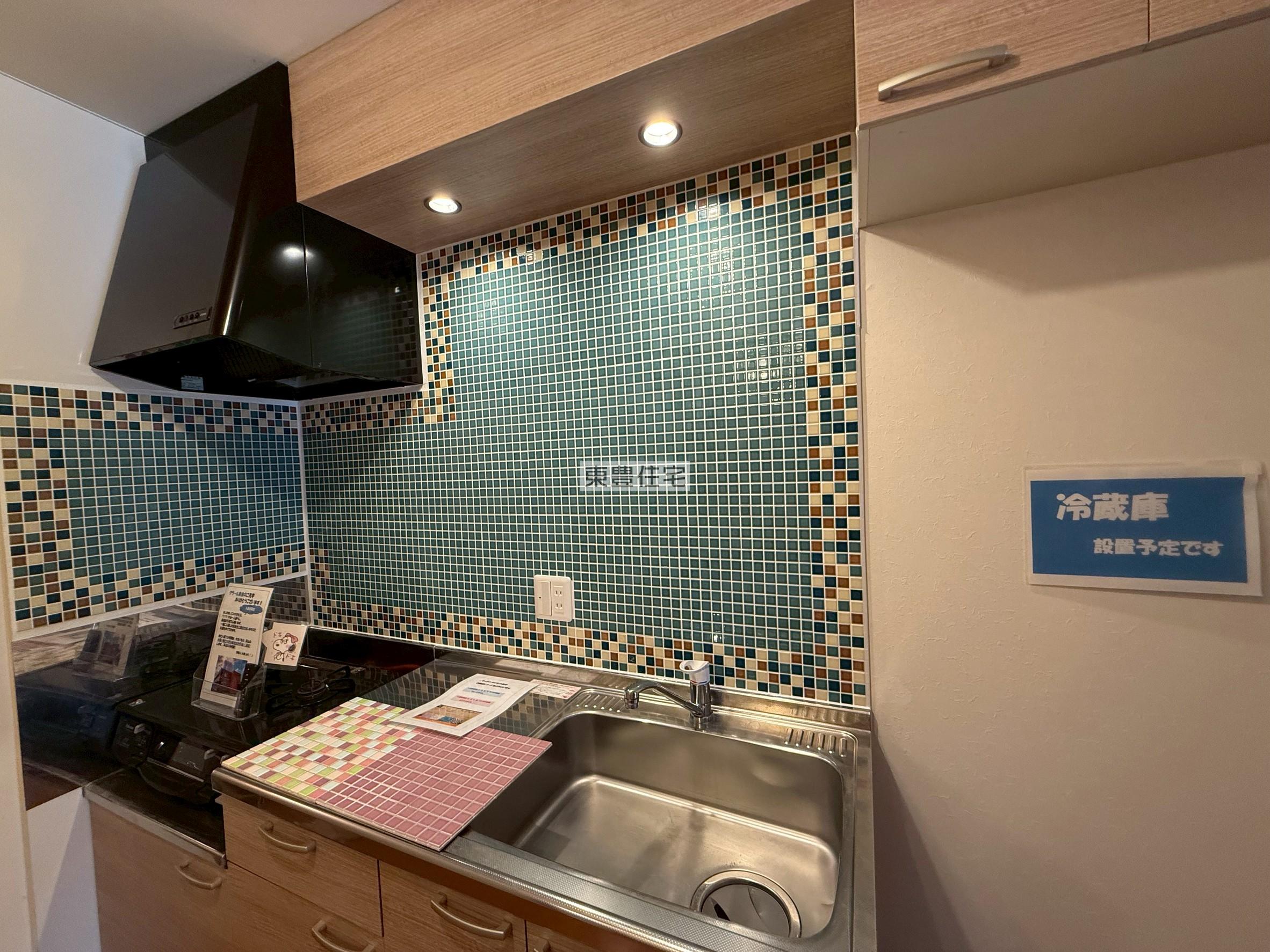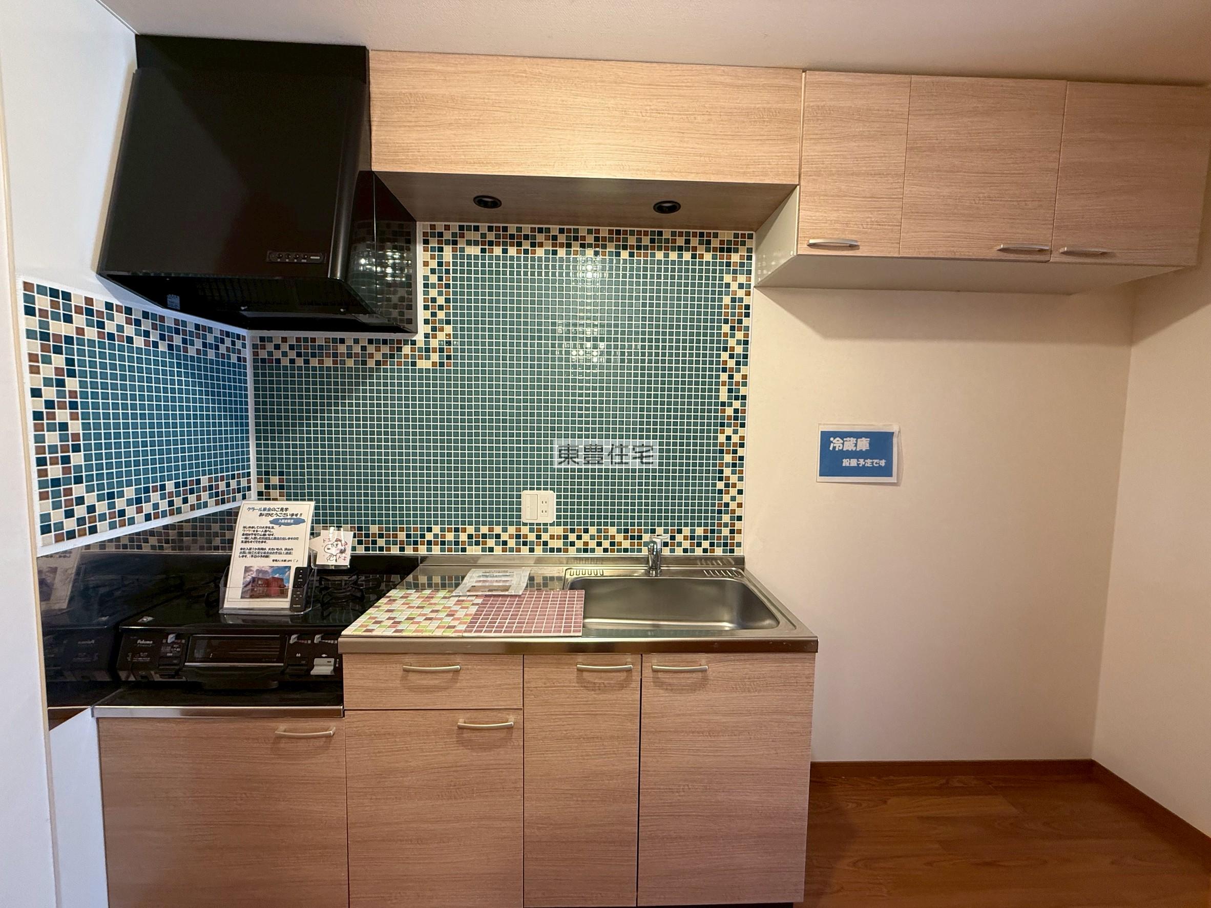 ガスコンロ、冷蔵庫もついてます・食器棚も置けそうですね